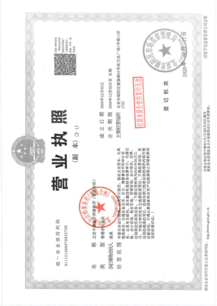 五、北京中廉会计师事务所(普通合伙)营业执照副本复印件