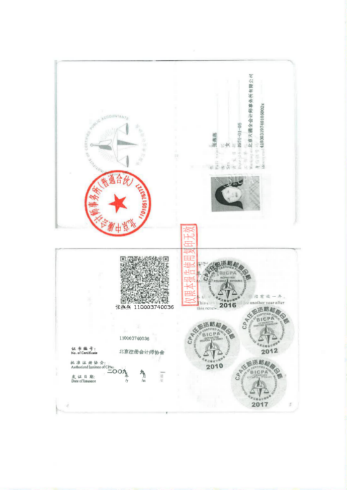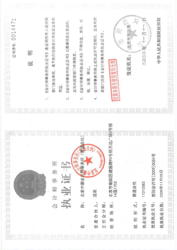 六、北京中廉会计师事务所(普通合伙)执业资格证书复印件